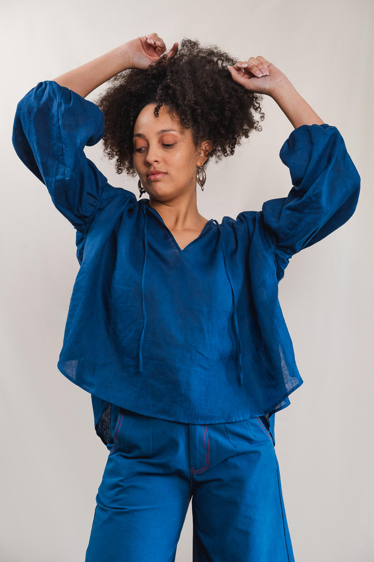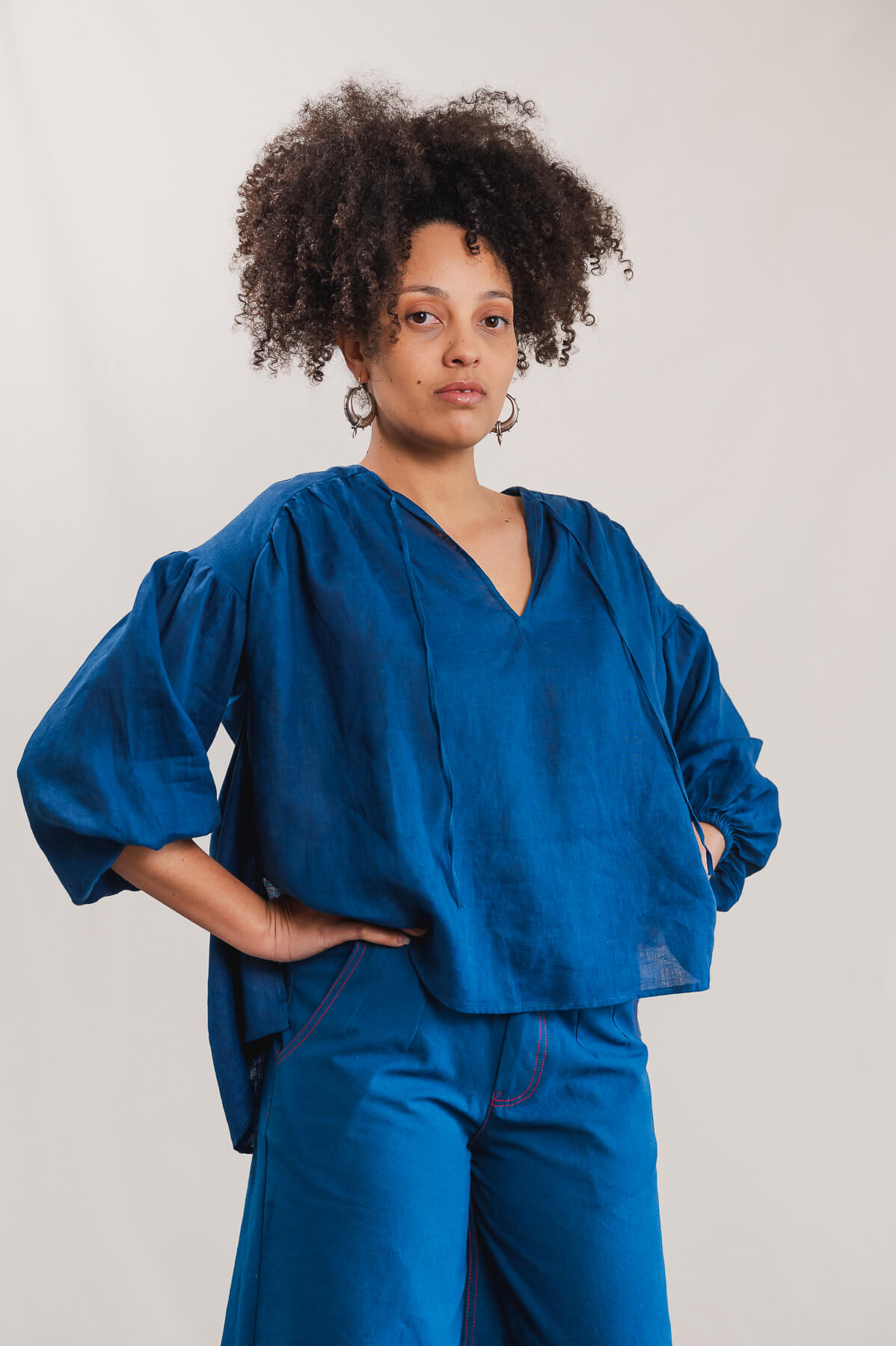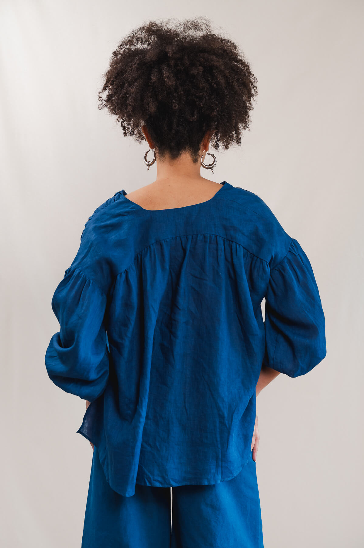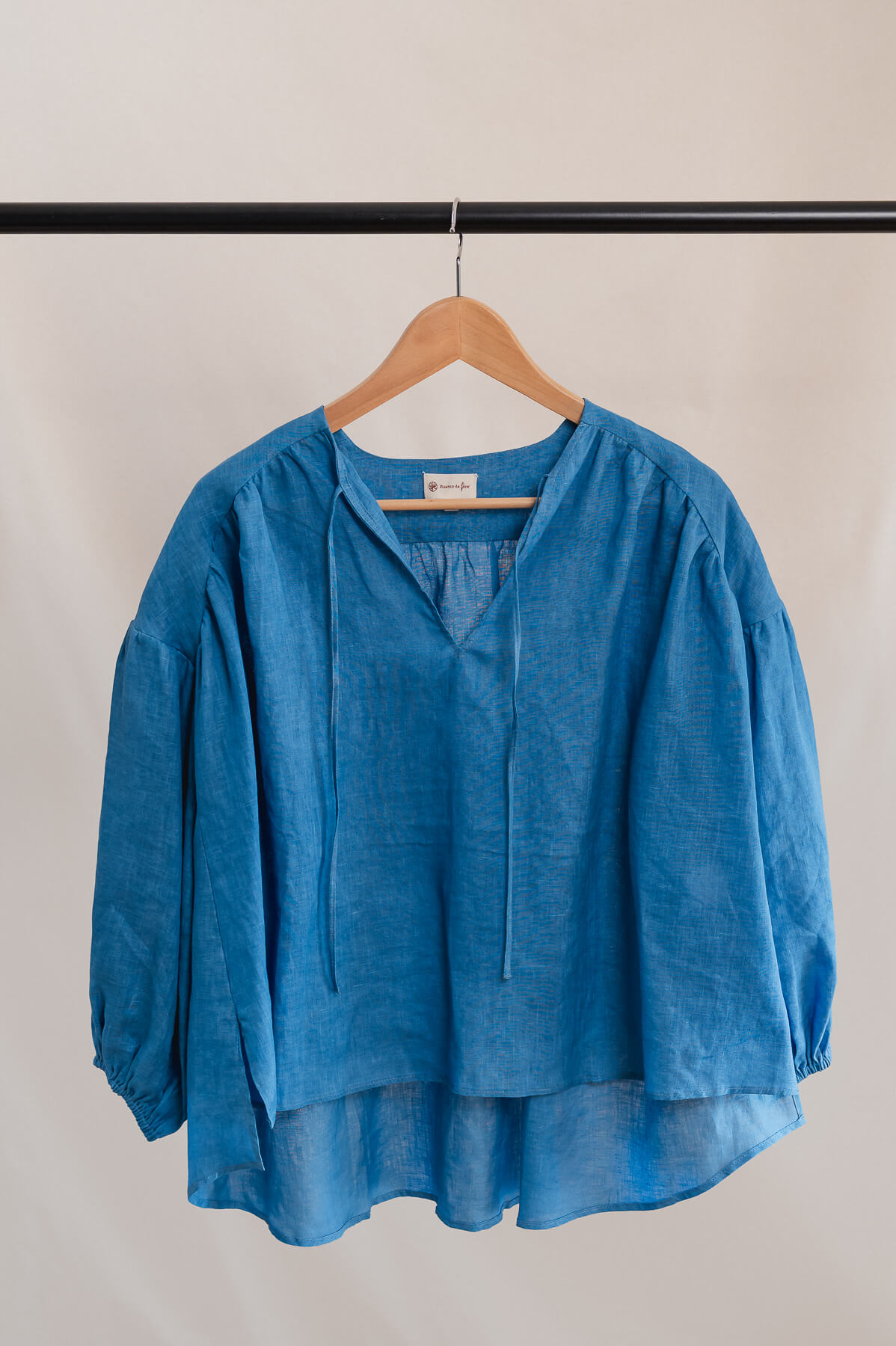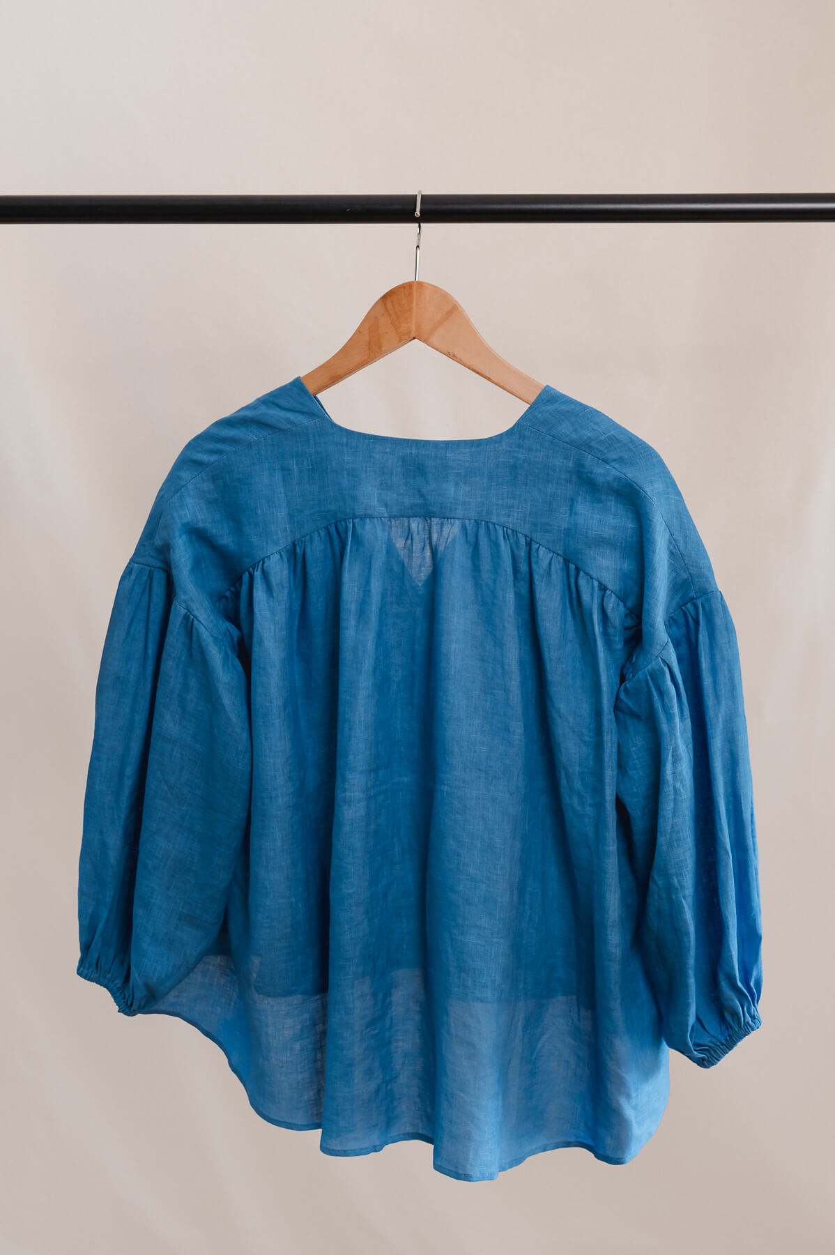 Ses manches bouffantes, froncées à l’épaule et aux poignets par de fins élastiques, se portent au gré de vos envies. Le décolleté en V, souligné de liens à nouer, révèle la peau avec subtilité. Les fronces sous les découpes épaules apportent du relief et de la douceur à la ligne, tandis que les fentes latérales accentuent la fluidité de l’ensemble.