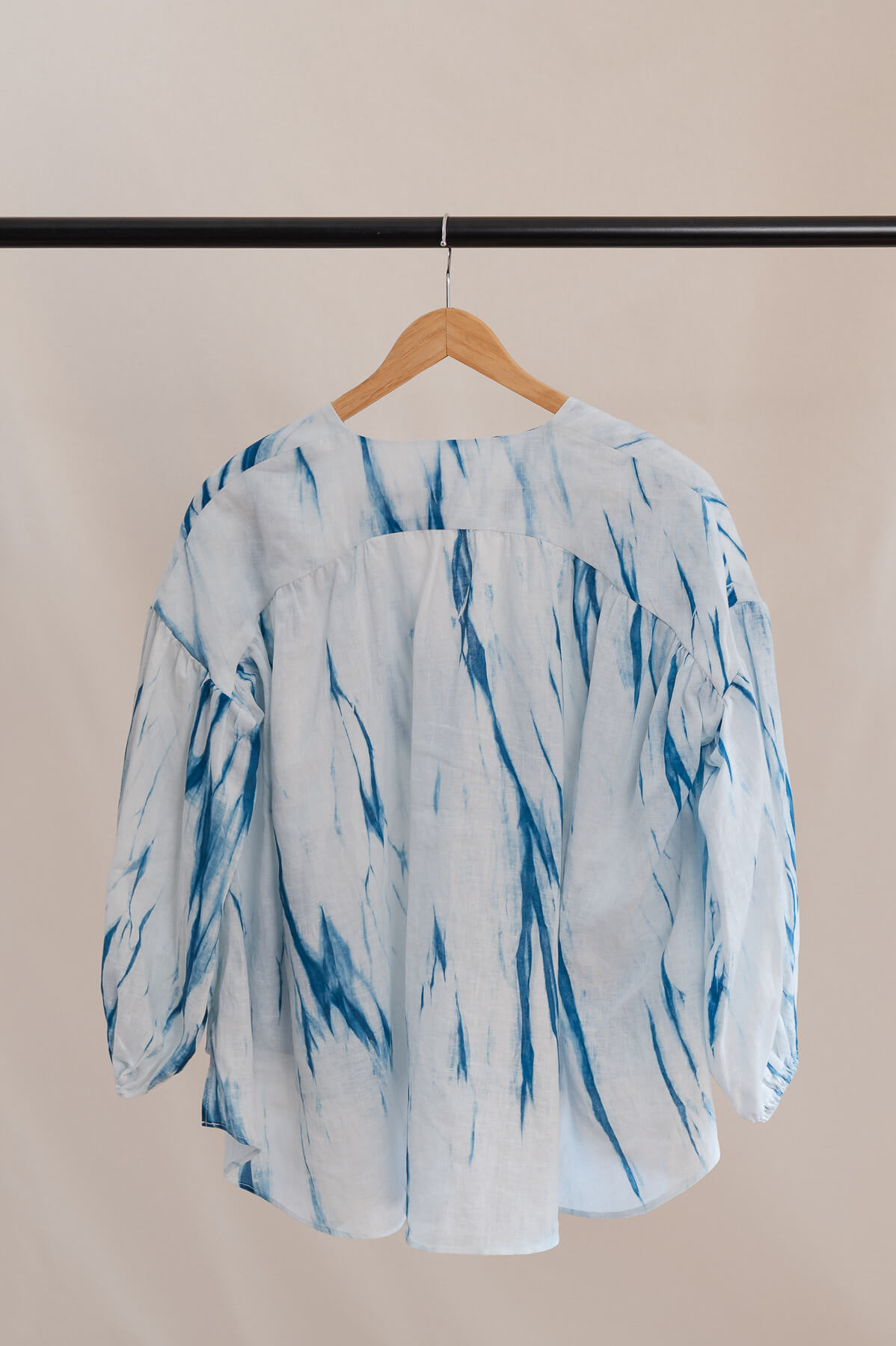 Le shibori est une technique ancestrale japonaise de teinture à réserve qui consiste à plier, nouer, comprimer ou coudre le tissu avant de le plonger dans le bain de teinture. Les zones ainsi protégées résistent au pigment, révélant à l’ouverture des motifs uniques, à la fois précis et organiques. Pour évoquer des vagues, le textile est délicatement plissé ou lié de manière rythmée, créant des ondulations fluides où l’indigo épouse la matière comme le mouvement de l’eau sur le sable. Chaque empreinte est vivante, imprévisible — à l’image de la mer elle-même.
