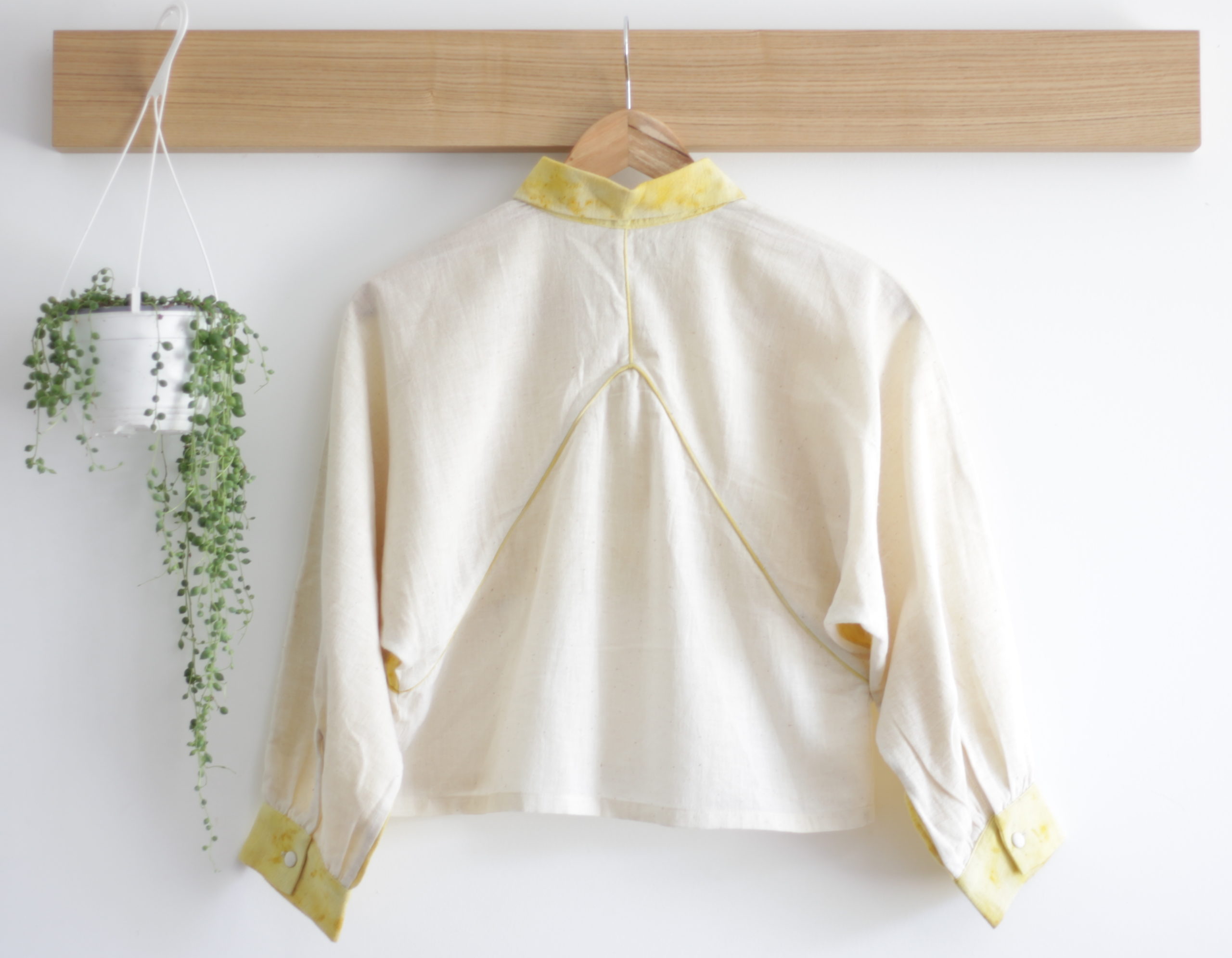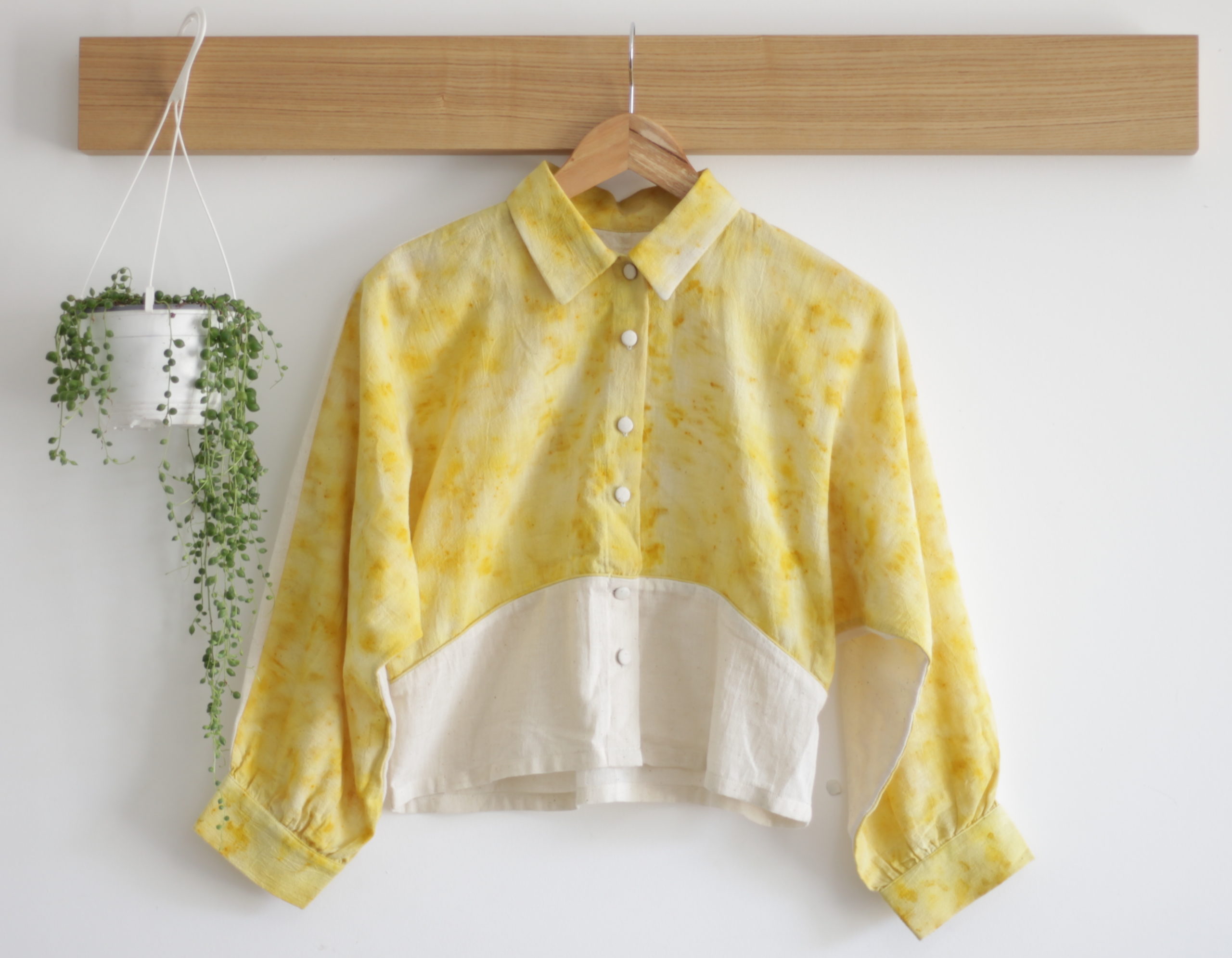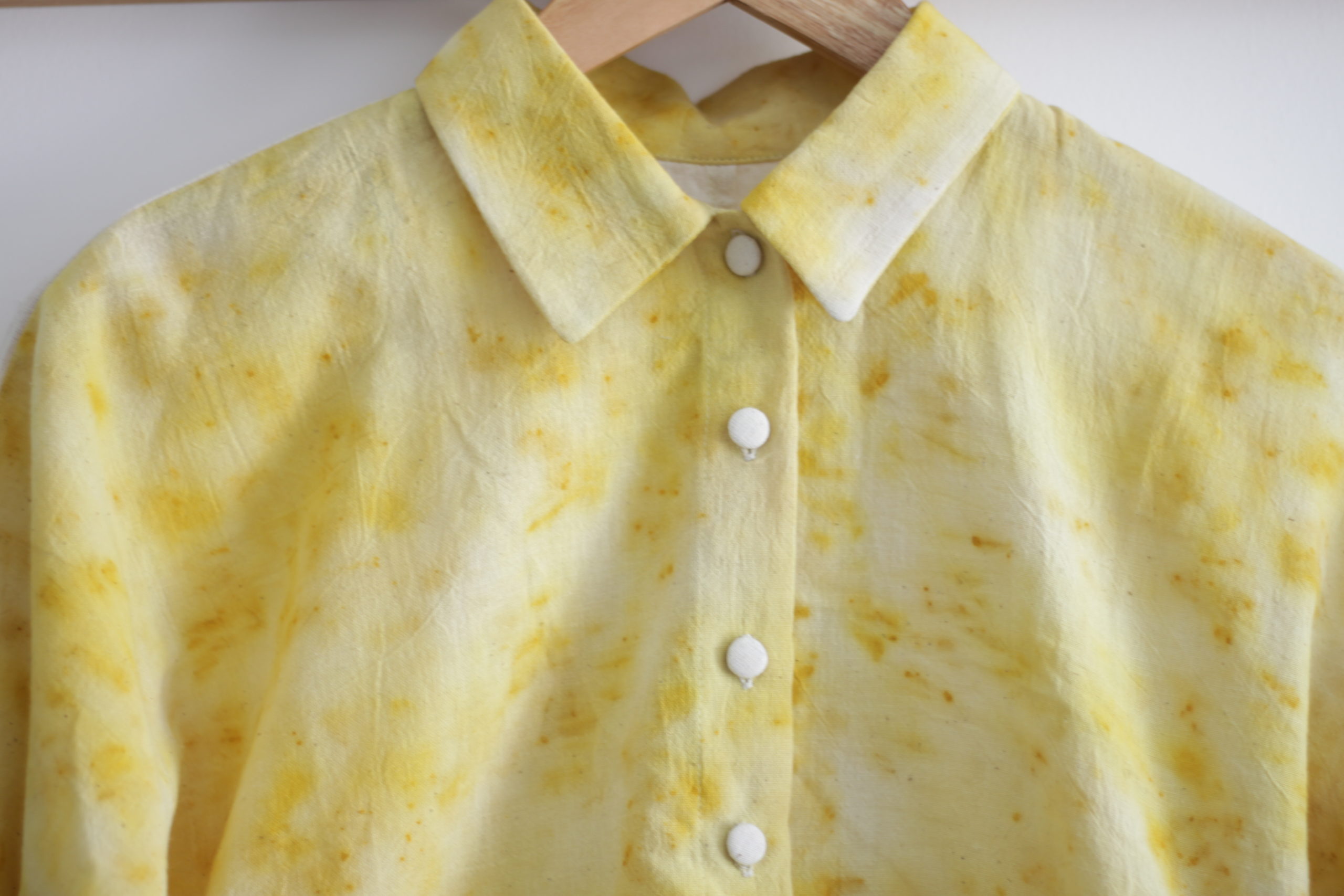 La chemise, un incontournable de notre vestiaire pour femme, se revisite dans une matière singulière et dans une nuance unique et solaire issue de la teinture naturelle, grâce à la technique de l’impression végétale.