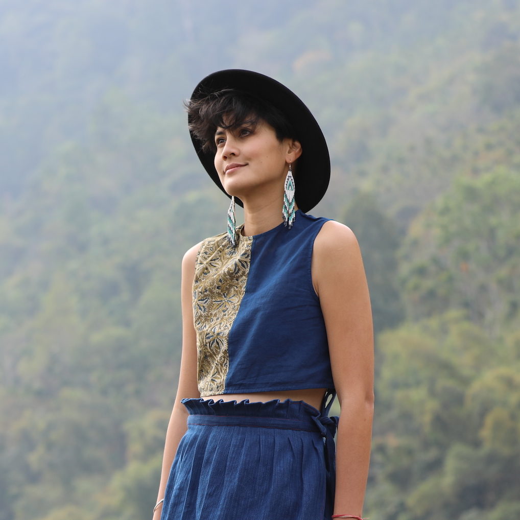 Ce crop top bleu indigo est 100% fait main : la matière est filée et tissée à la main, d’où ses imperfections, caractéristique du travail fait main et de son authenticité. Le fil a été teint dans un bain d’indigo.