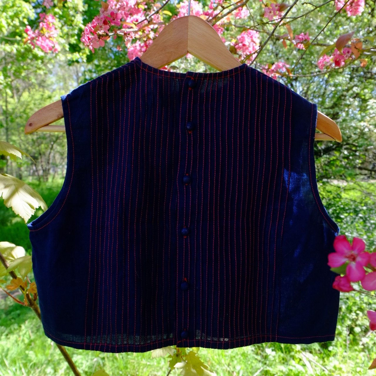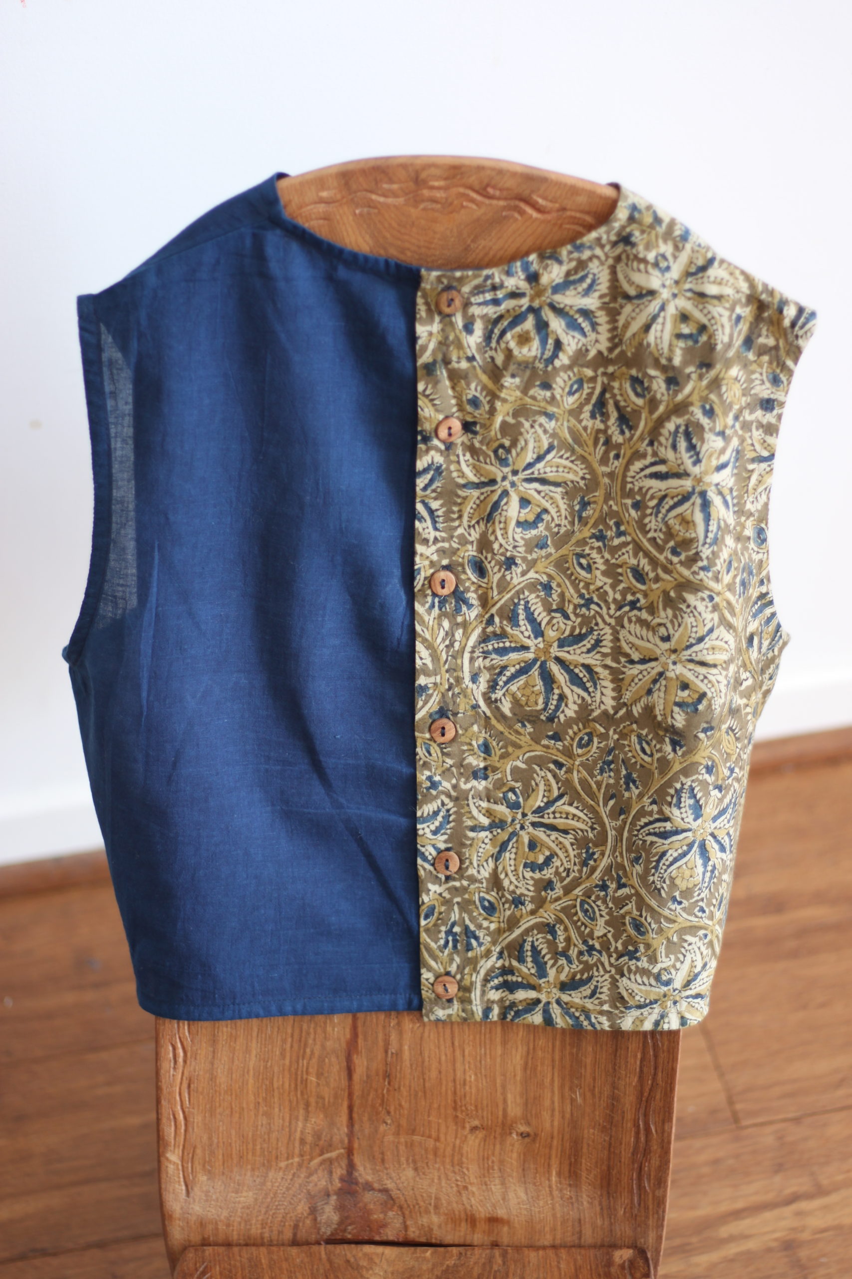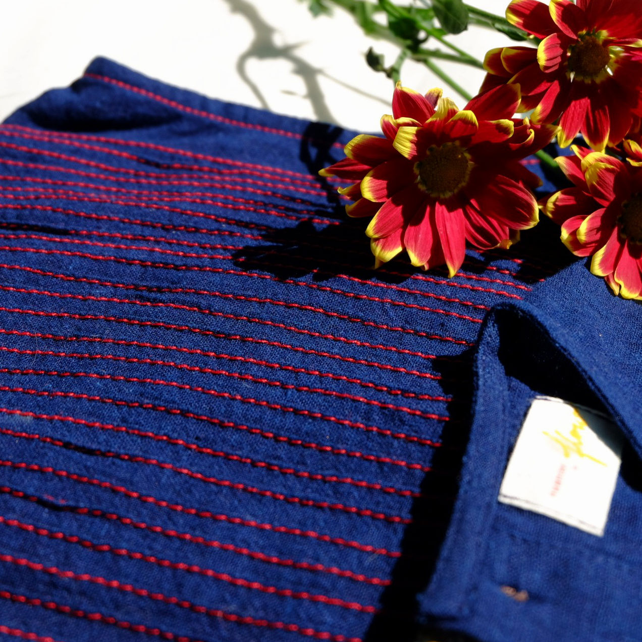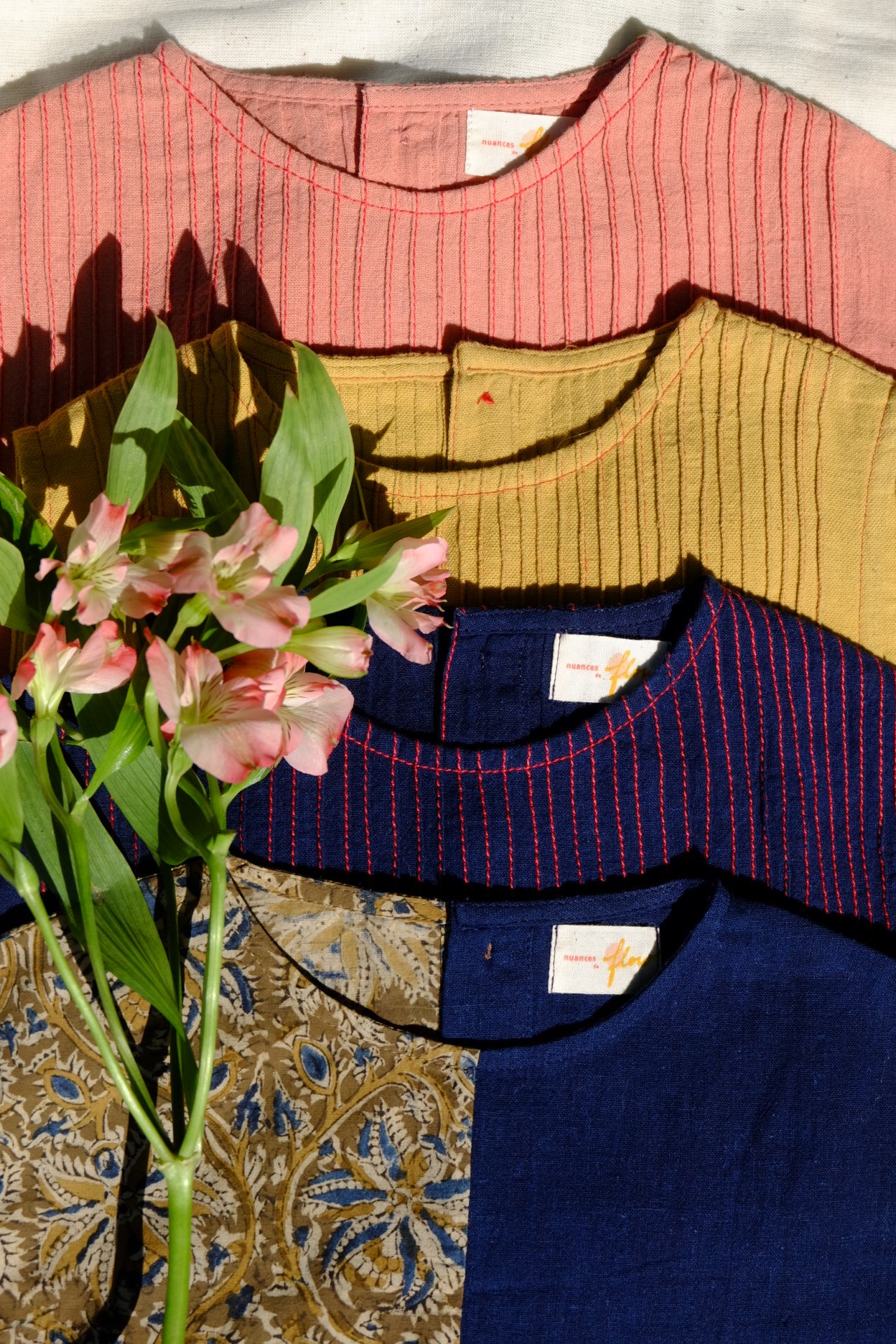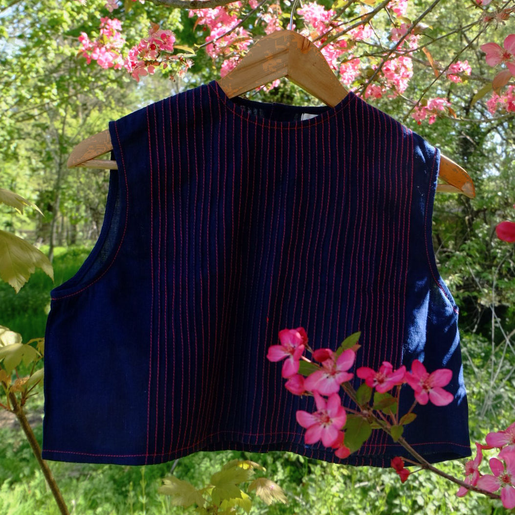 Basique par sa forme, ce crop top se pare de jolis détails pour en faire une pièce singulière et originale : un délicat plissé devant et dos, des surpiqûres contrastantes rouge pour renforcer la profondeur du bleu obtenu par la teinture végétale (Indigofera Tinctoria) ou bien, le modèle bicolore uni / block print, fini par des boutons dans le dos.