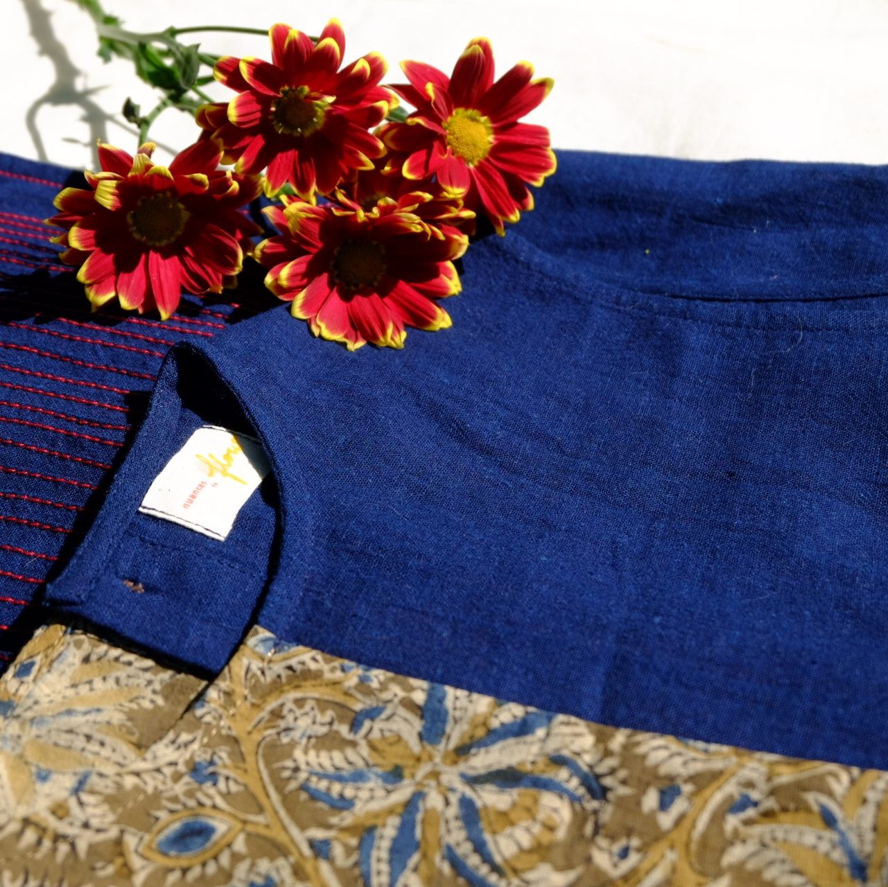 Disponible en bleu indigo plissé en coton-soie ou bicolore indigo / block print 100% coton.
