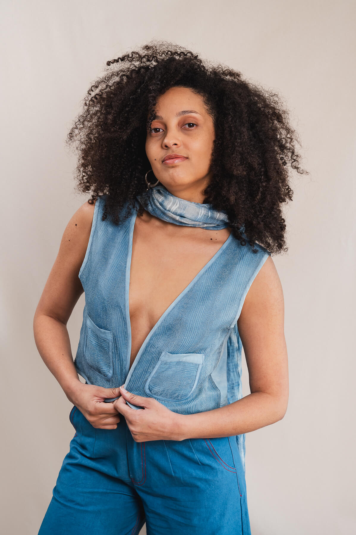 Matière exceptionnelle pour ce gilet sans manches EVA : un mélange de soie et de laine bouclée tissé issu d’un fin de rouleau.