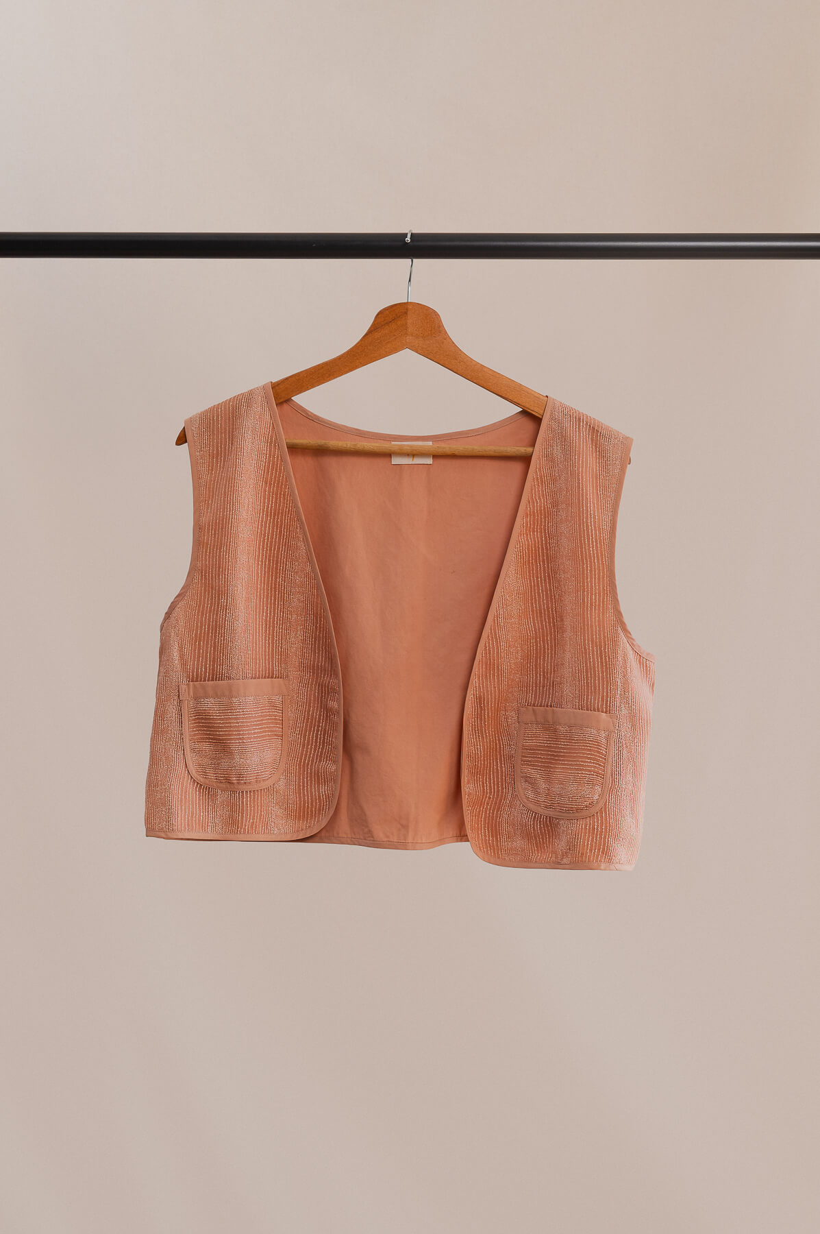 Ce gilet sans manches en soie style serveur se revisite court et près du corps. Il possède une doublure en coton et des mini-poches. Complétez votre look avec le pantalon large dans le même tissu, à associer avec un top ou un t-shirt. Ou bien, portez-le avec votre jean et top préféré pour une tenue plus décontractée.