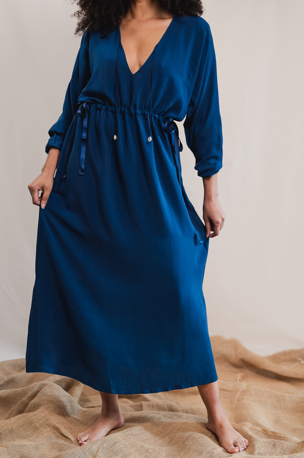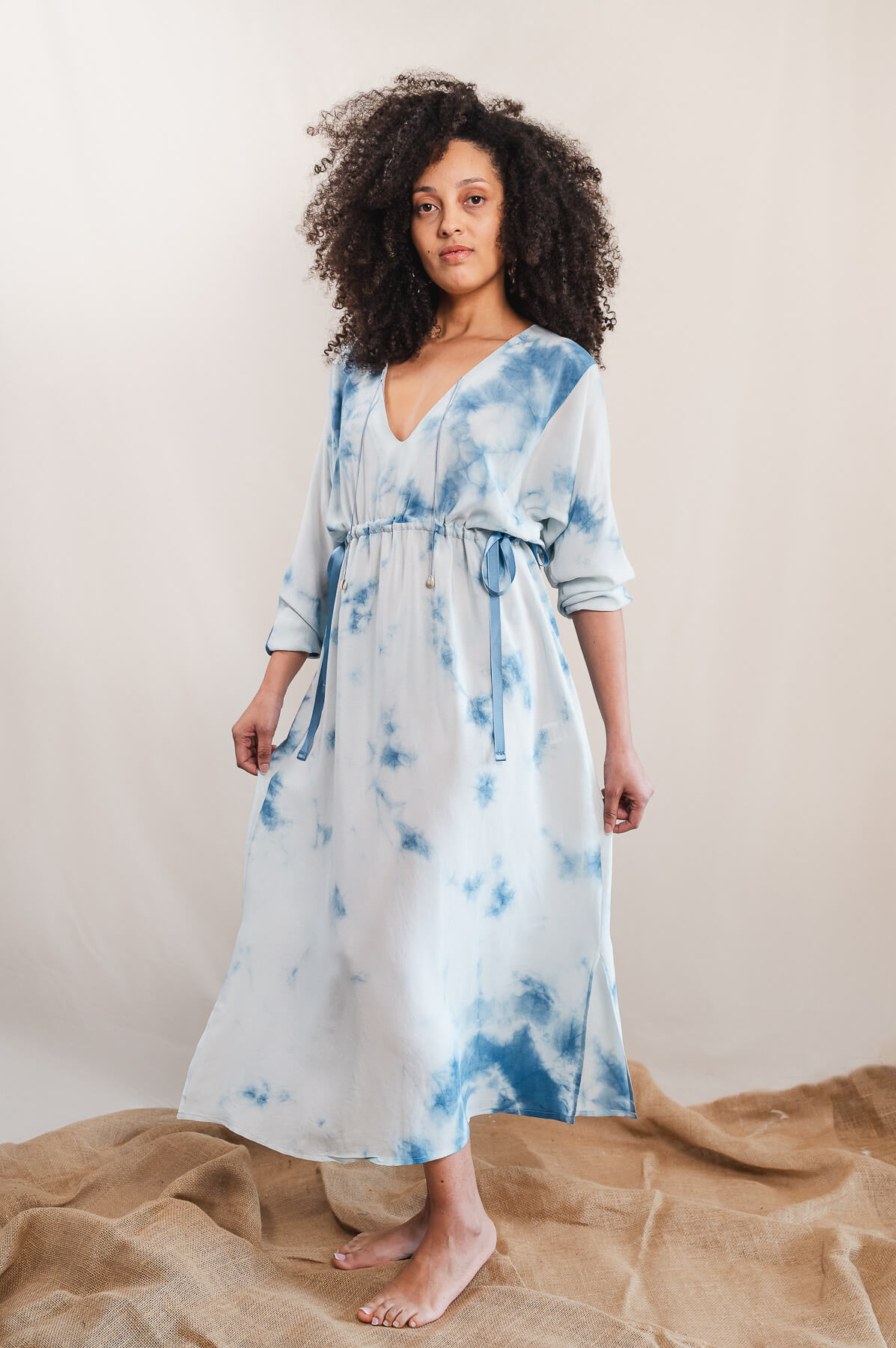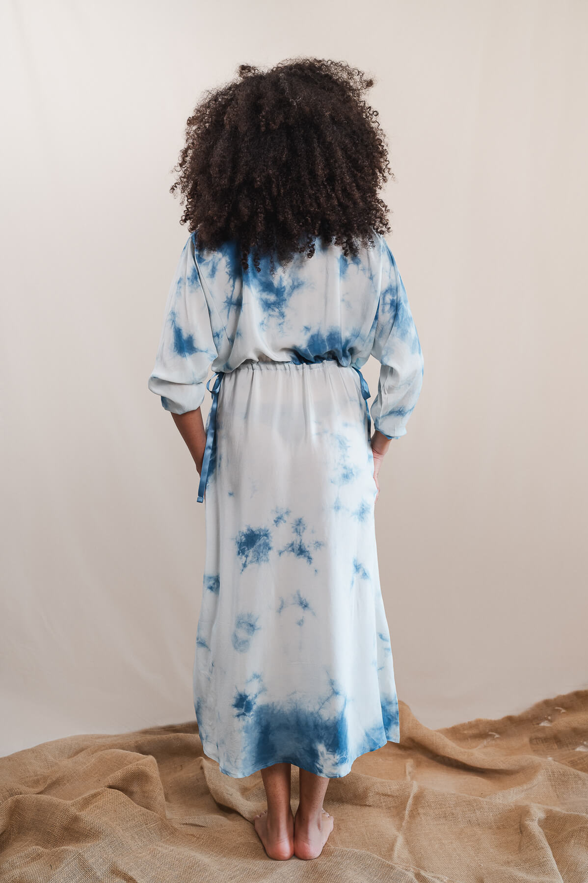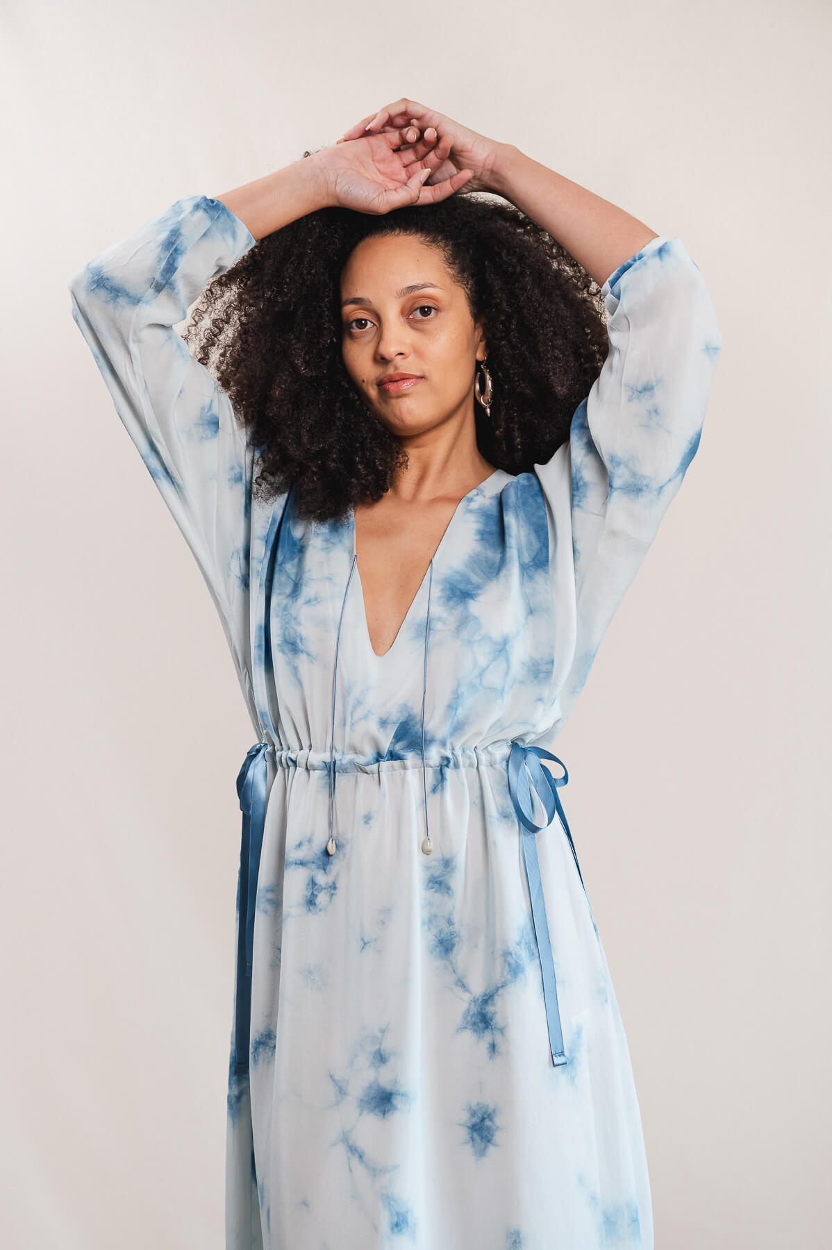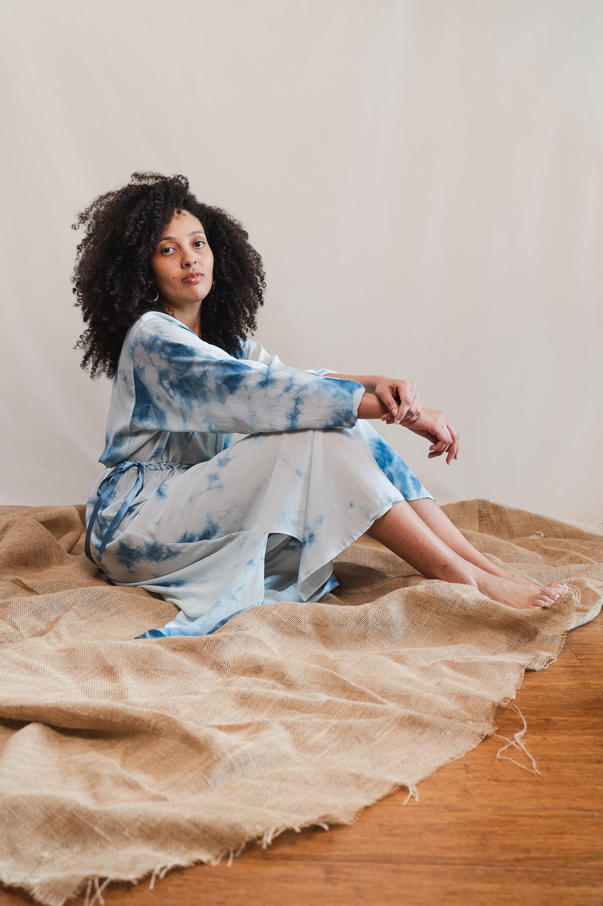 Confectionnée en crêpe de soie, à la texture douce et lumineuse, la robe NILA effleure la peau avec une légèreté exquise. Issue d’un fin de rouleau soigneusement sélectionné, l’étoffe a été teintée artisanalement à l’indigo naturel, révélant des nuances profondes et vibrantes.