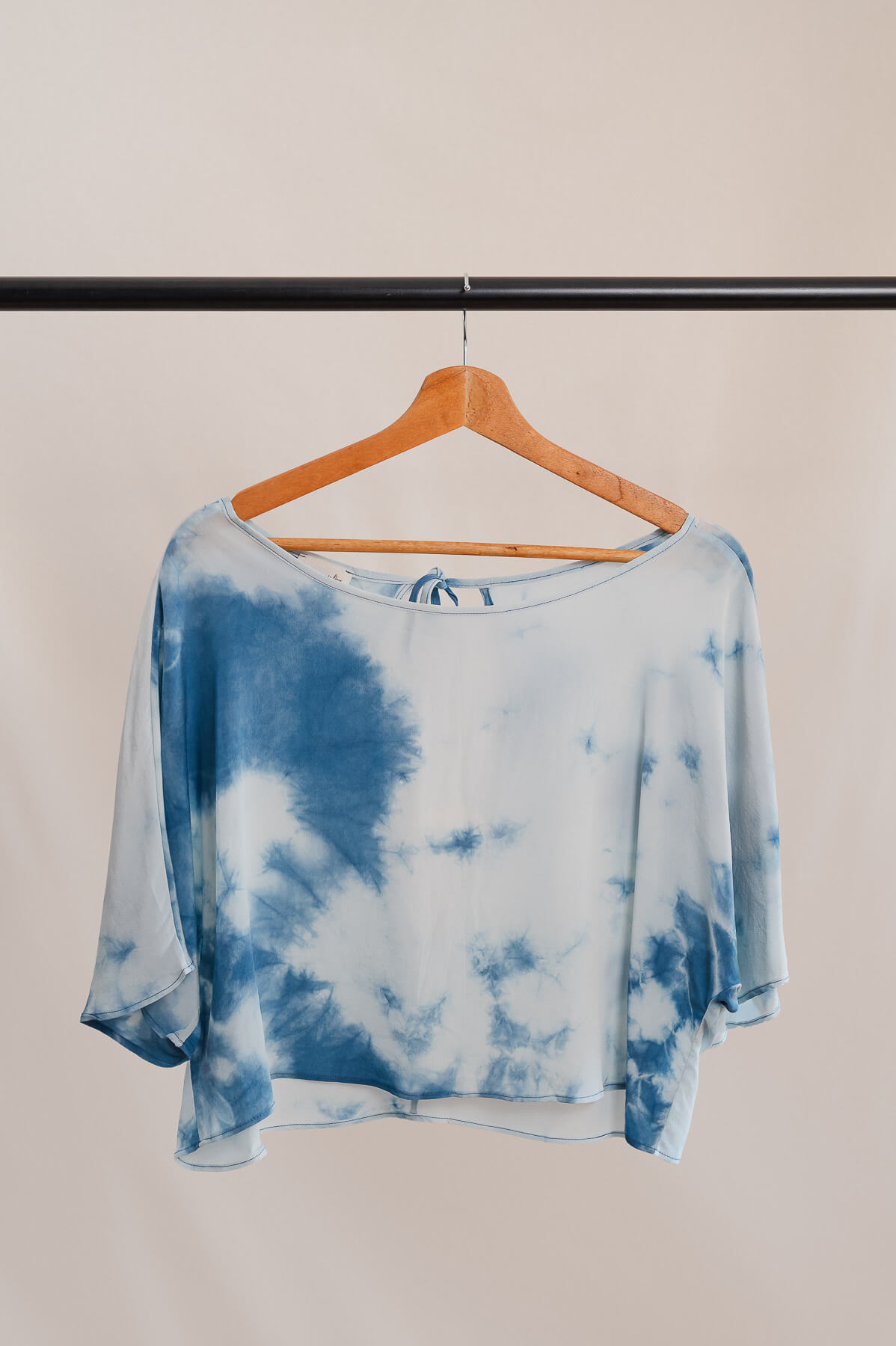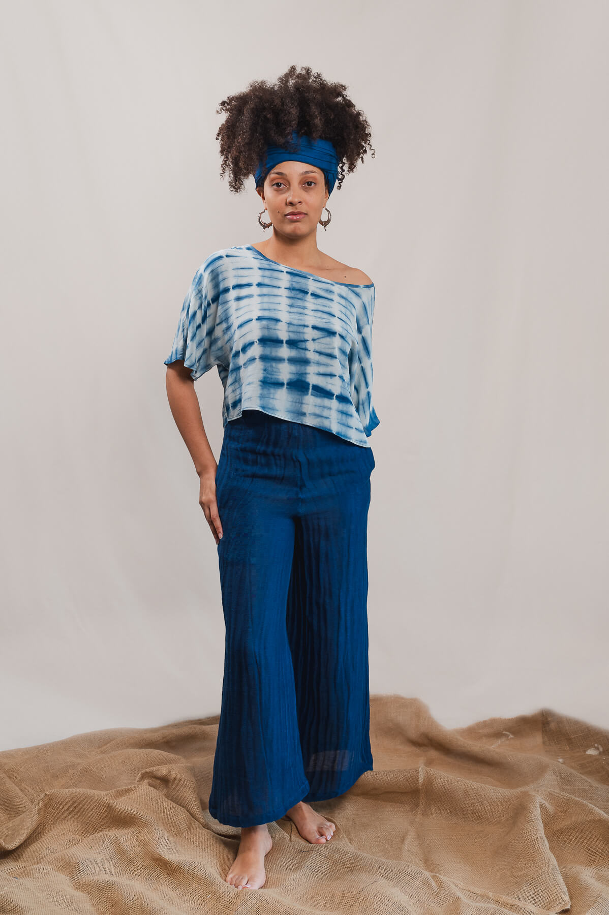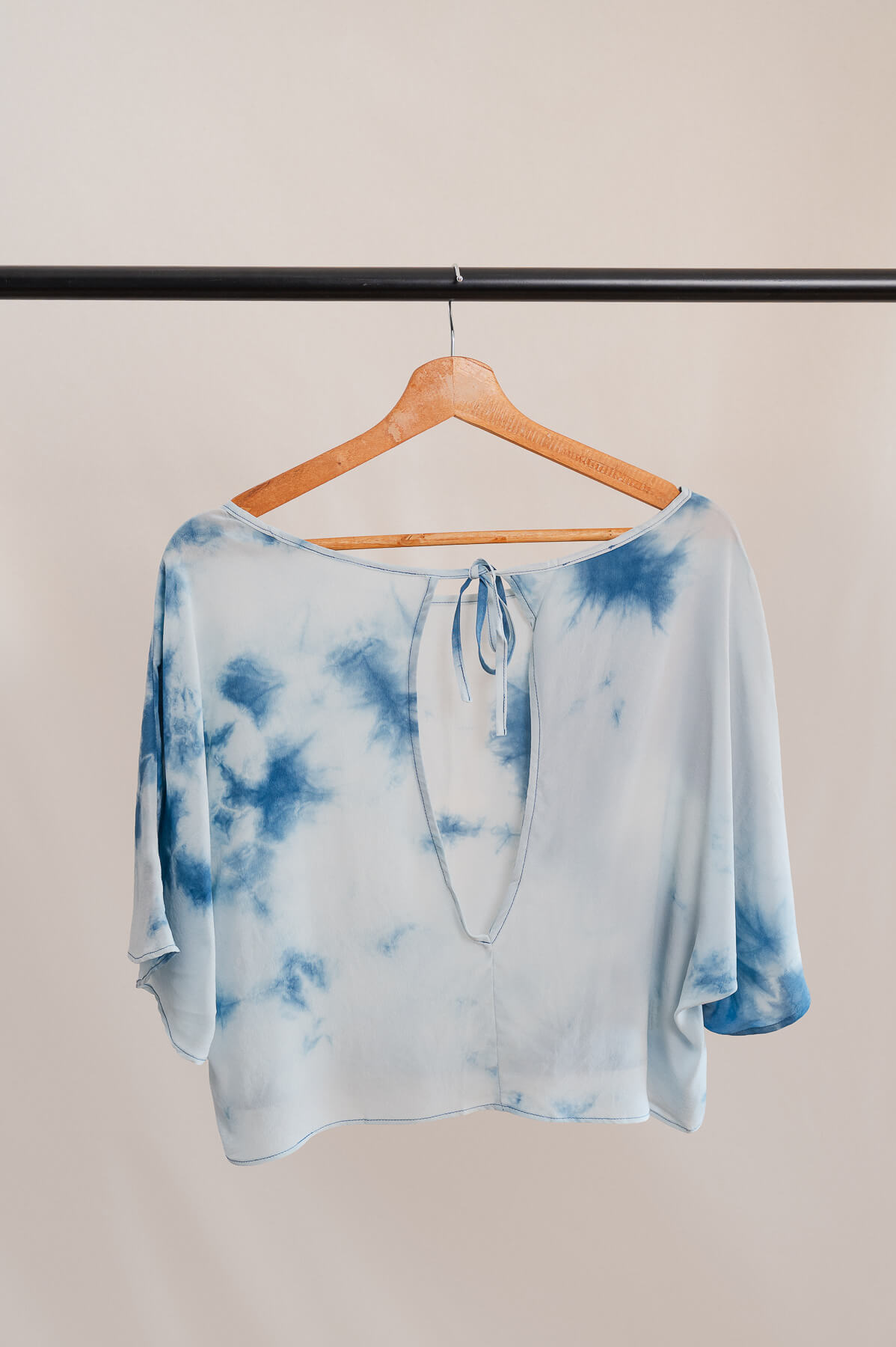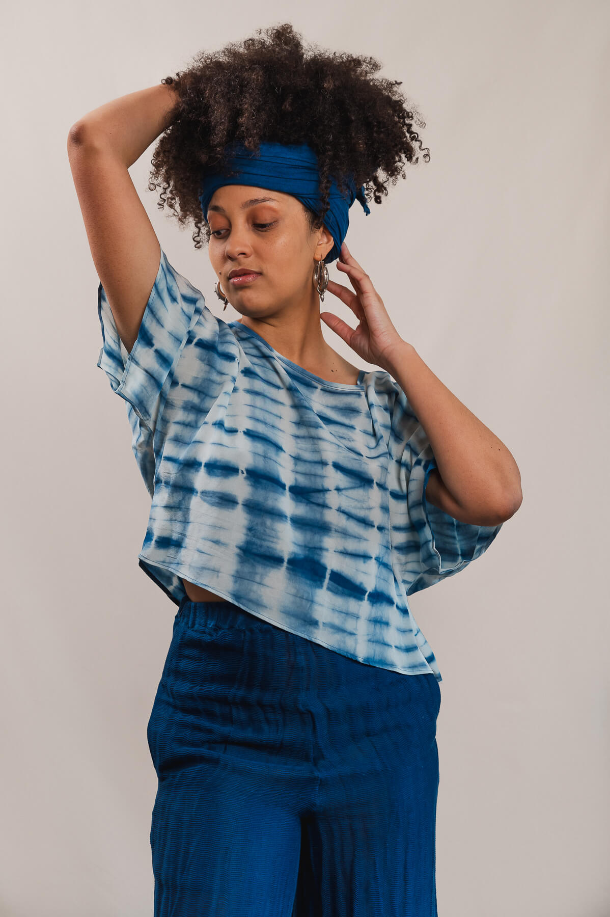 Confectionné en crêpe de soie, MEY épouse le corps avec légèreté et confort. Issu d’un fin de rouleau soigneusement sélectionné, le tissu a été teint artisanalement à l’indigo naturel, révélant des nuances vibrantes et singulières. Chaque pièce porte ainsi les irrégularités nobles du geste artisanal, rendant chaque modèle unique.