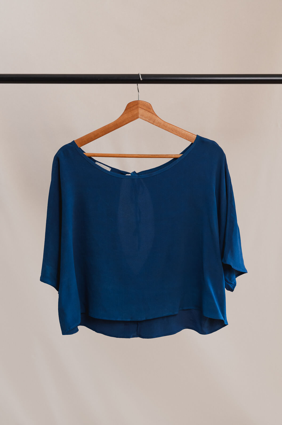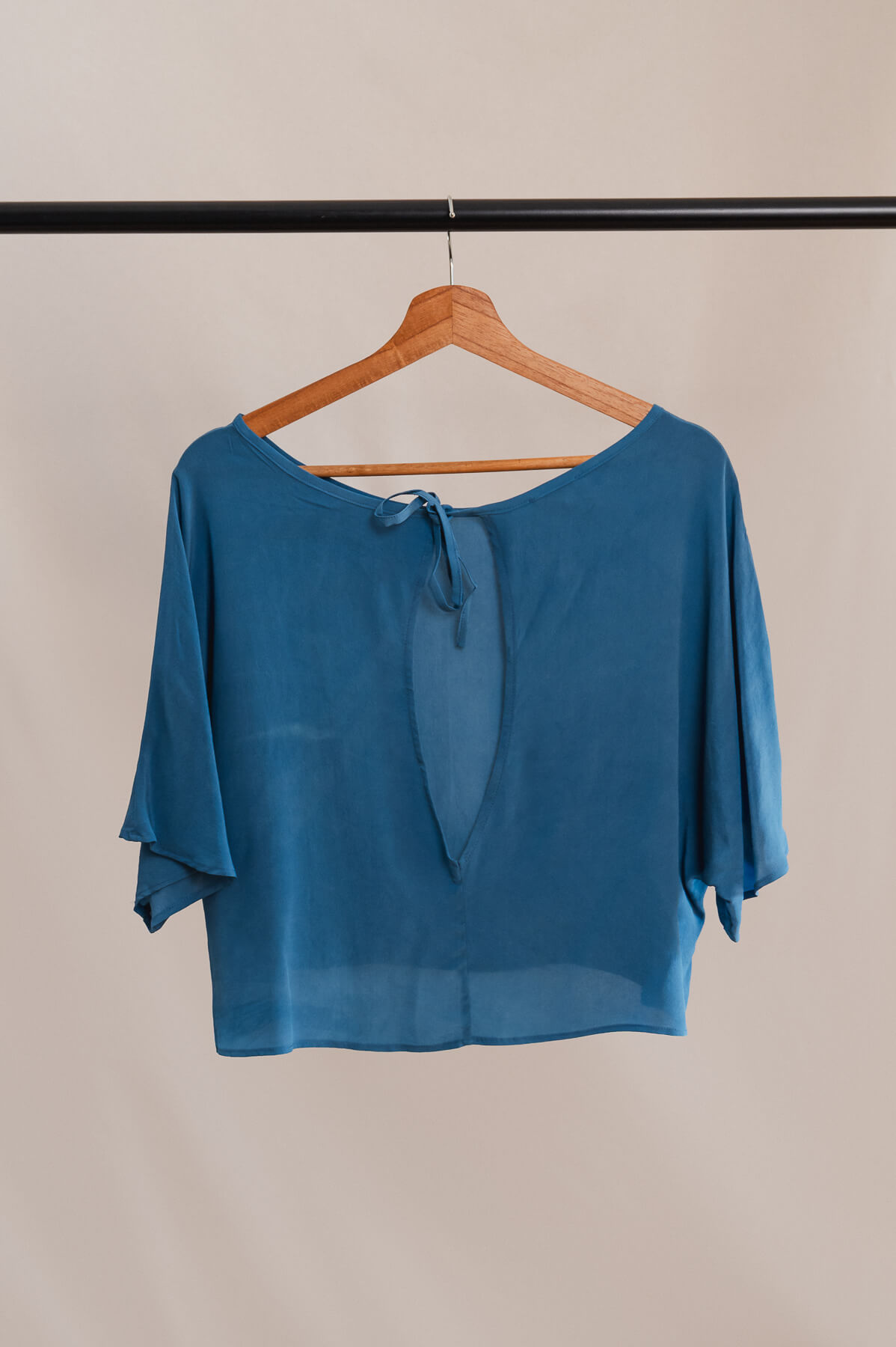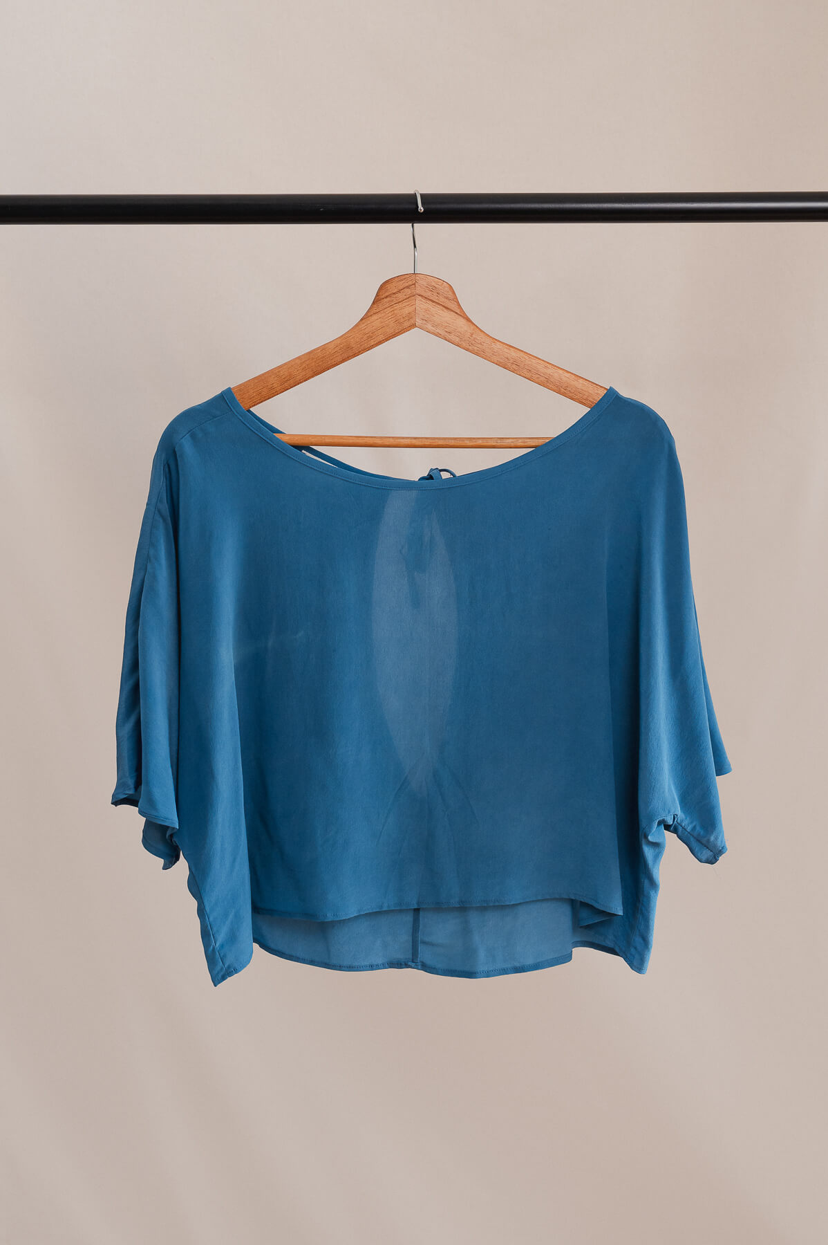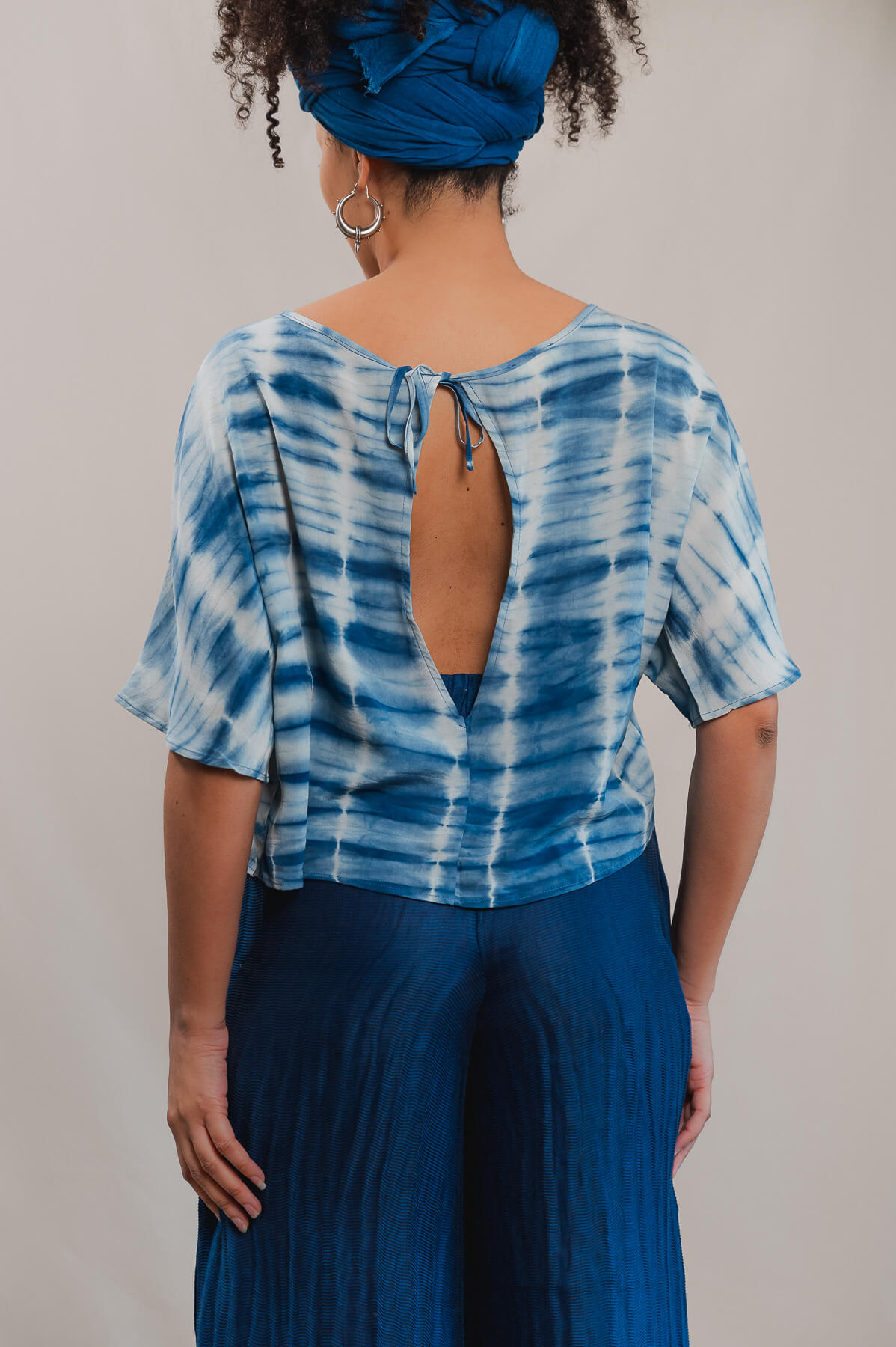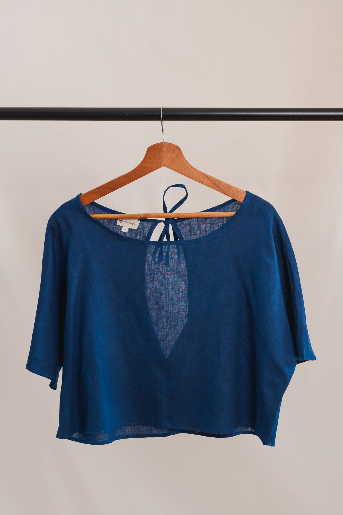 Confectionné en crêpe de soie, MEY épouse le corps avec légèreté et confort. Issu d’un fin de rouleau soigneusement sélectionné, le tissu a été teint artisanalement à l’indigo naturel, révélant des nuances vibrantes et singulières. Chaque pièce porte ainsi les irrégularités nobles du geste artisanal, rendant chaque modèle unique.